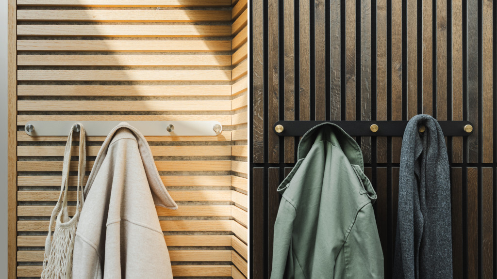En enkel, modulær knaggrekke som festes direkte på Akupanelene dine. Ingen skruer, ingen verktøy, ingen merker i veggen. Bare et ryddig, skandinavisk uttrykk som passer perfekt inn.
