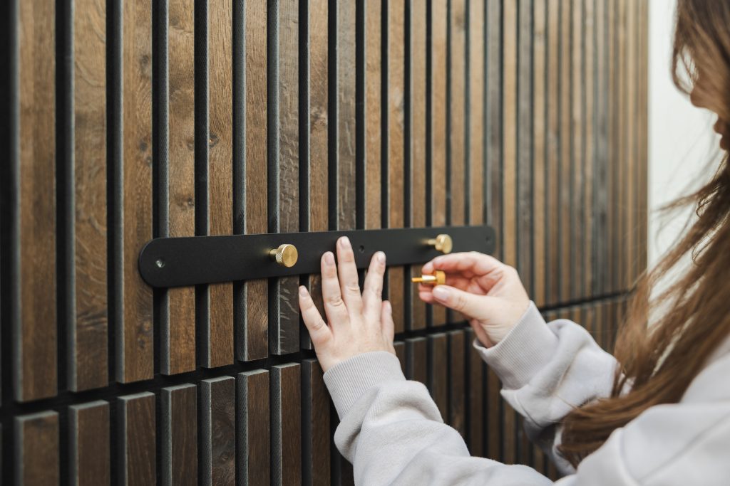Finnes med fem eller sju knagger, og tåler opptil 15 kg. Når behovene endrer seg – flytt den dit du vil, uten å skade panelene eller veggen bak.