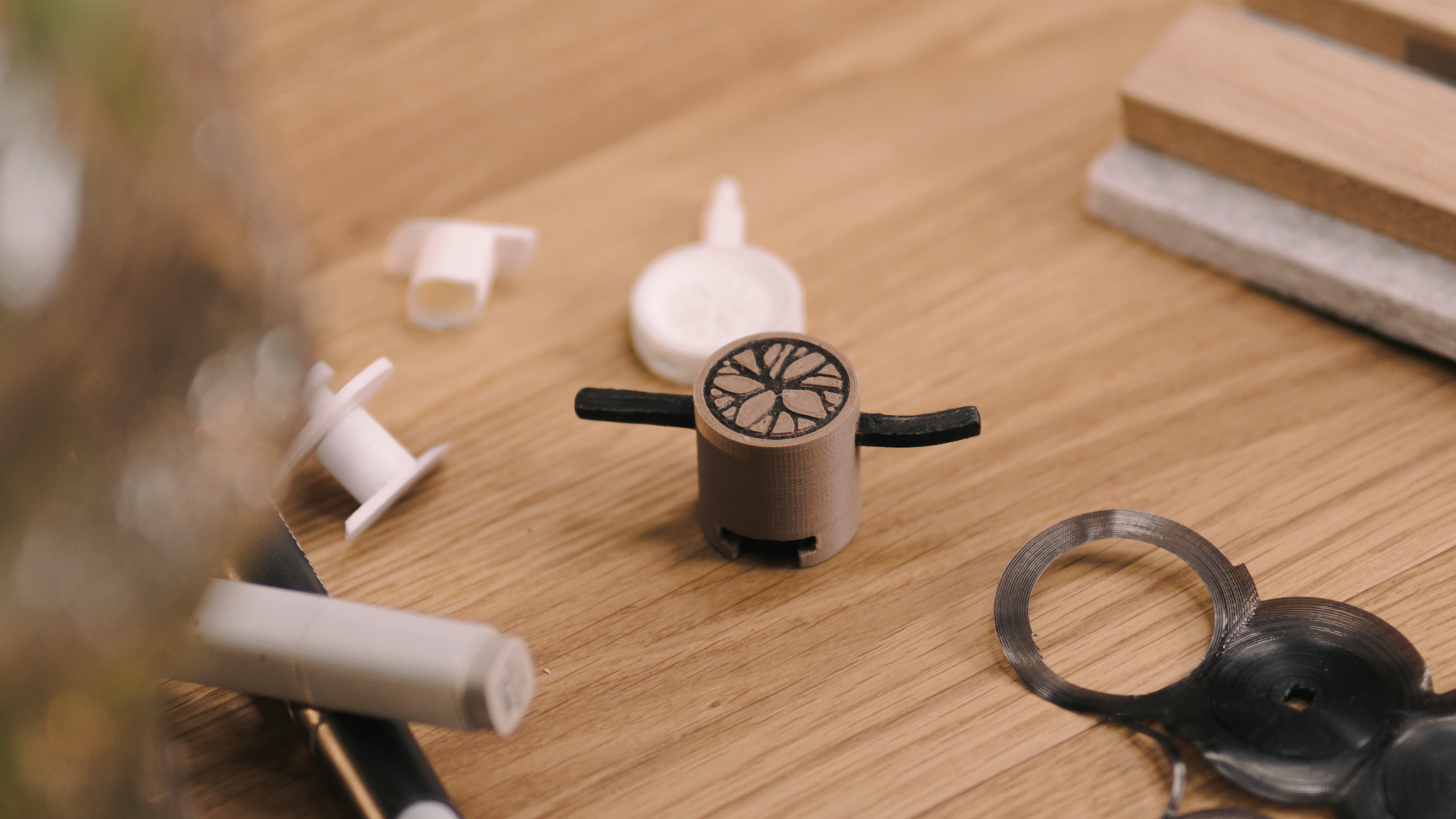 Martin elsker å finne smarte løsninger på praktiske problemer. Først begynte han å tegne på en idé for å feste bilderammer. En 3D-printet prototype fulgte – med små «vinger» som låser seg bak spilene, og et skrupress som holder alt på plass. Men hvorfor stoppe der? Hva om man kunne henge opp mer enn bilder? Hyller? Knagger? Kanskje til og med små møbler? Uten å bore i, eller skade veggen?