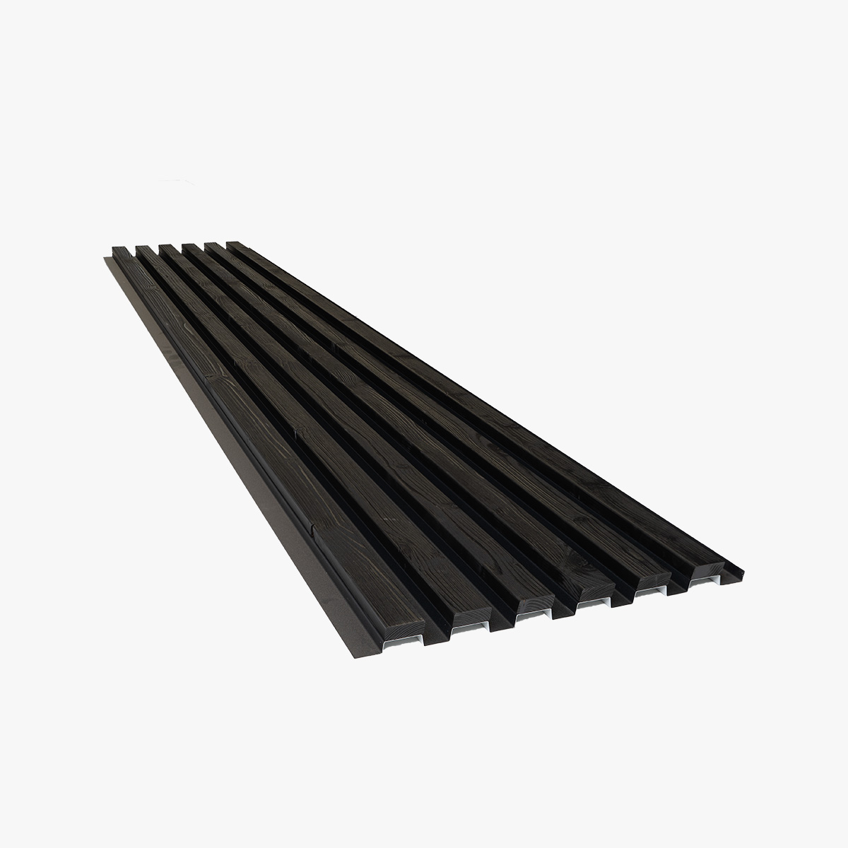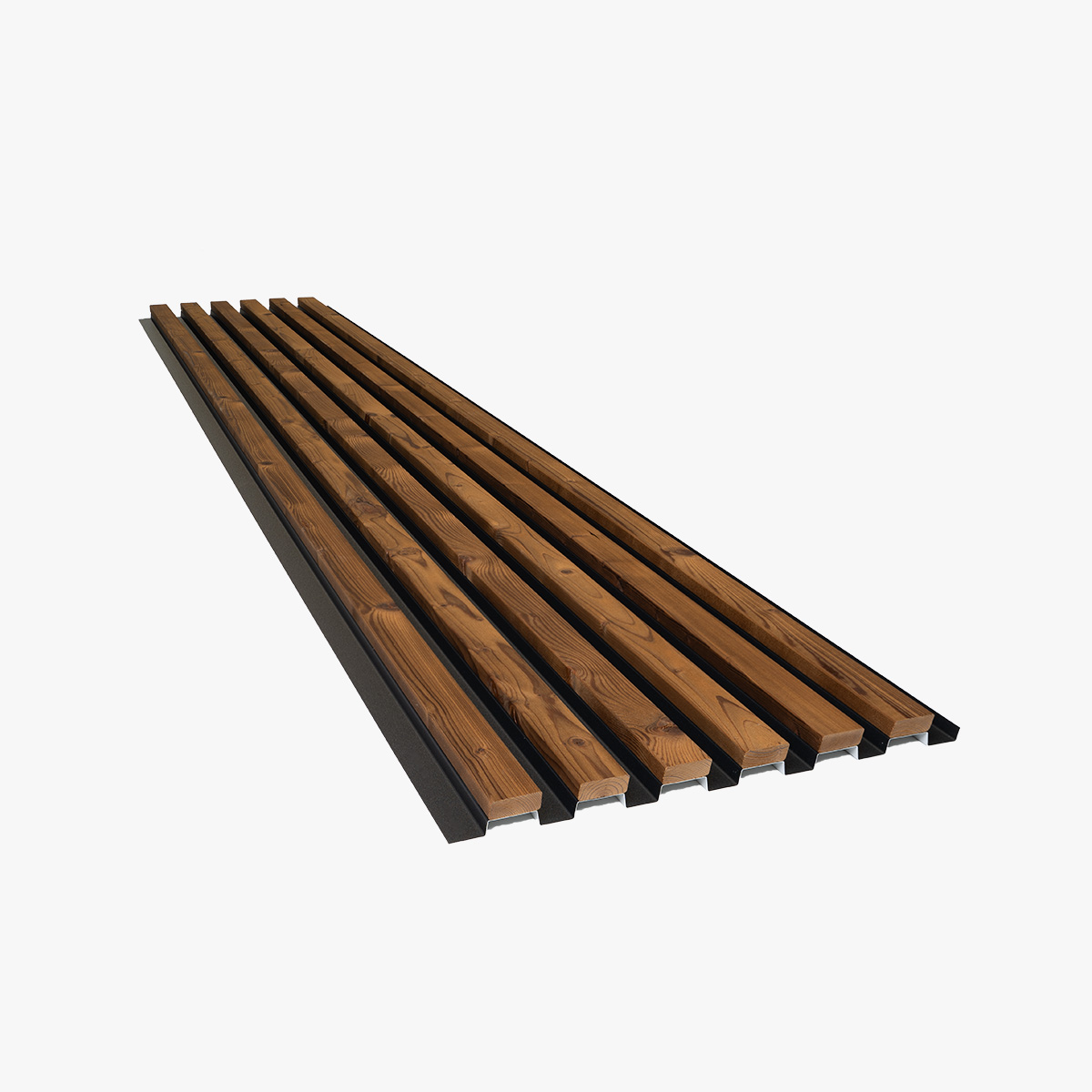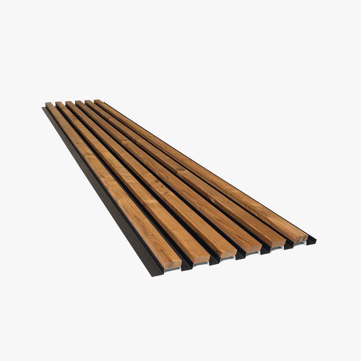 Termisk behandlet furupaneler er limt til en pulverlakkert aluminiumsbakgrunn — en konstruksjon utviklet og produsert i Skærbæk, Danmark. Resultatet er varmen og årene av ekte tre, holdt på plass av en struktur som ikke vil vri, bøye eller sag.