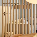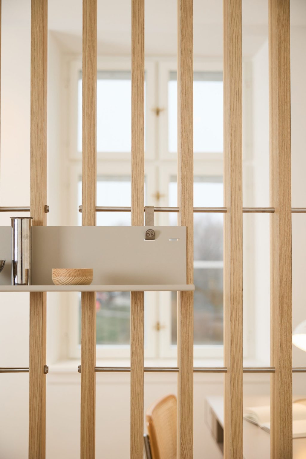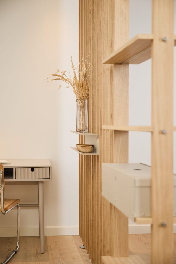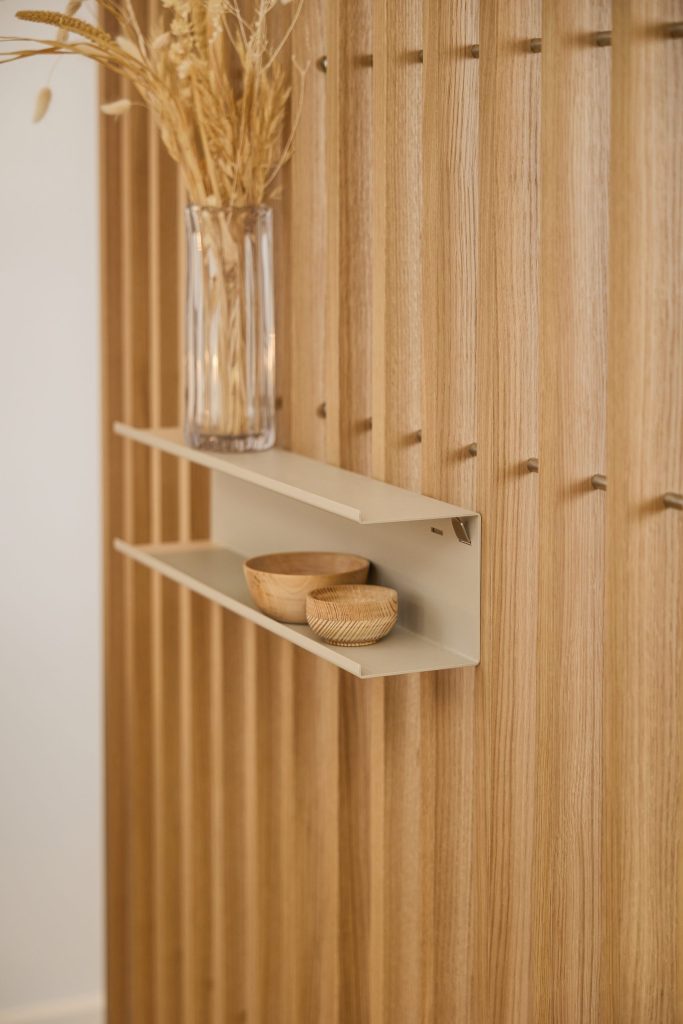 Embrace | BM1 er en av de to kjerne modulene i Embrace-systemet. Laget av eikefiner og rustfritt stål, BM1 monteres mellom gulv og tak og hjelper til med å skape klare soner med struktur og formål.