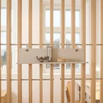Lagert av rustfritt stål og høykvalitets pulverlakkert stål, smelter den sømløst inn i Embrace-strukturen og holder alt åpent, rolig og gjennomtenkt.